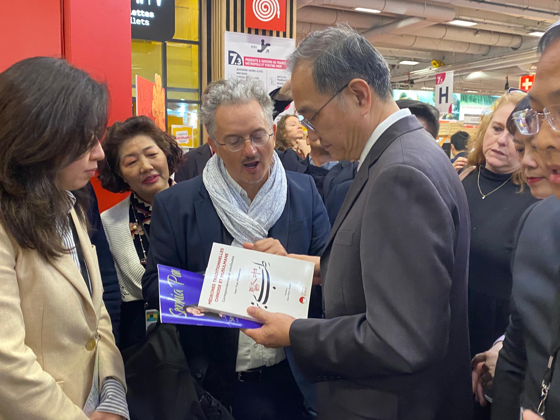 国际食品与药用植物研究院名誉院长Jean-Yves Moisseron教授向邓励大使赠书《Medecines traditionnelles Chinoise et musulmanes: similitudes et correspondance》