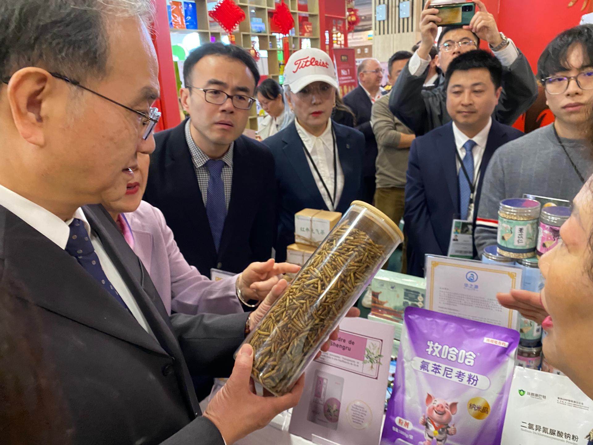 河南农业大学生命科学学院杨森教授(左)与河南农业大学宋利存副教授、中国驻法国大使馆前农业外交官(中)向邓励大使介绍黑水虻产品