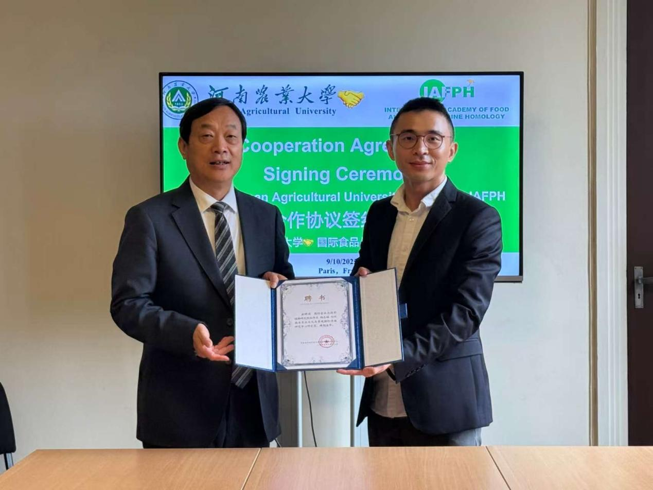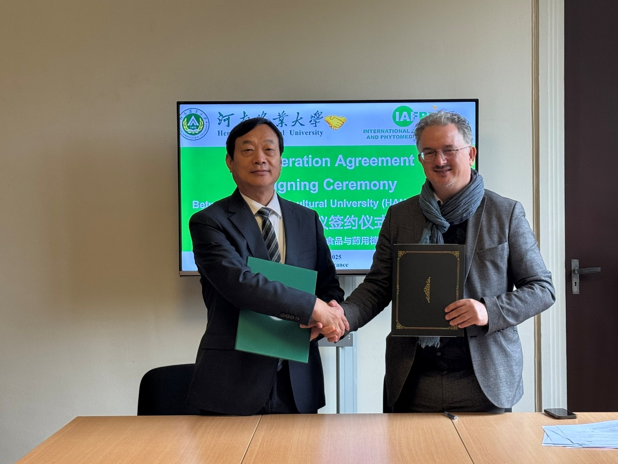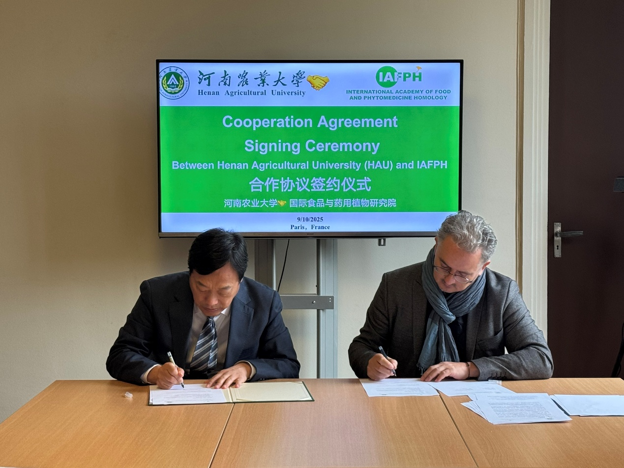 在河南农业大学校长、中国工程院院士周卫率领的代表团访问法国期间,河南农业大学与国际食品与药用植物研究院(International Academy of Food & Phytomedicine Homology,IAFPH,音译:雅夫研究院)在法国巴黎正式签署战略合作协议。双方将以“药食同源”理念为纽带,携手构建中法联合科研与创新合作平台,推动农业科技创新与健康产业融合发展。