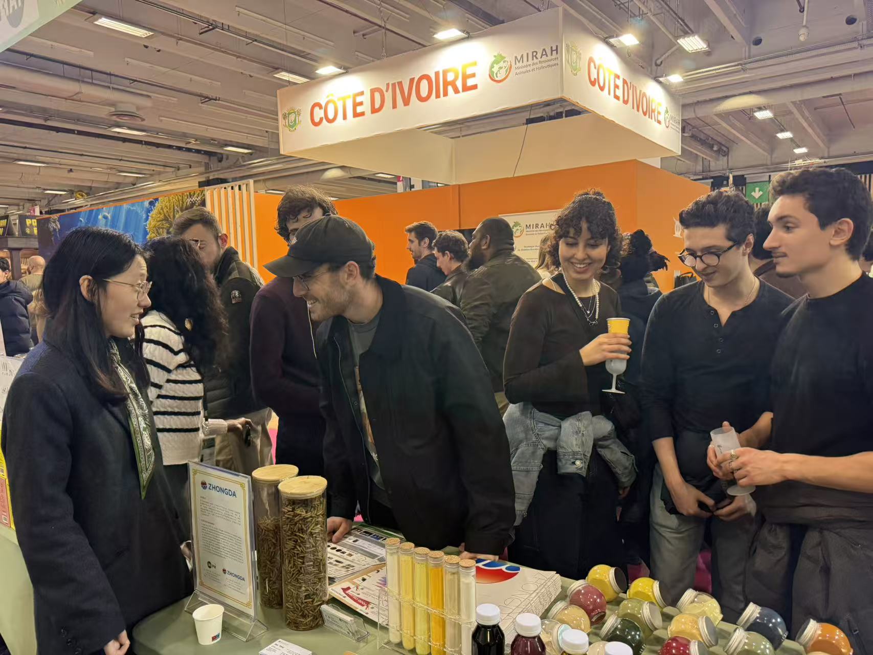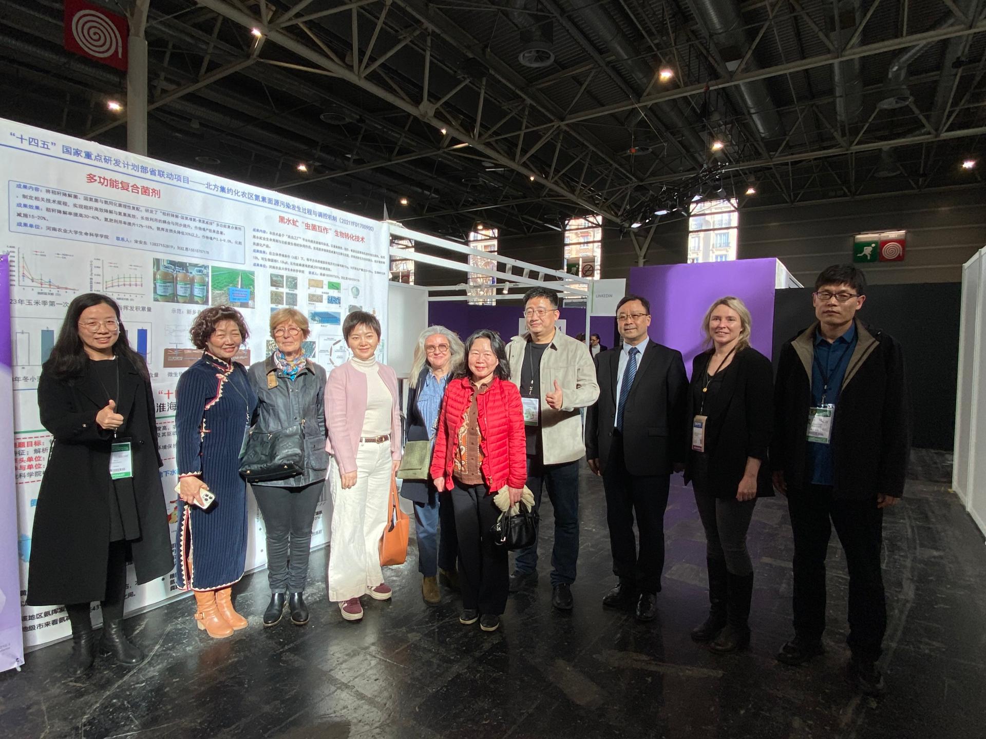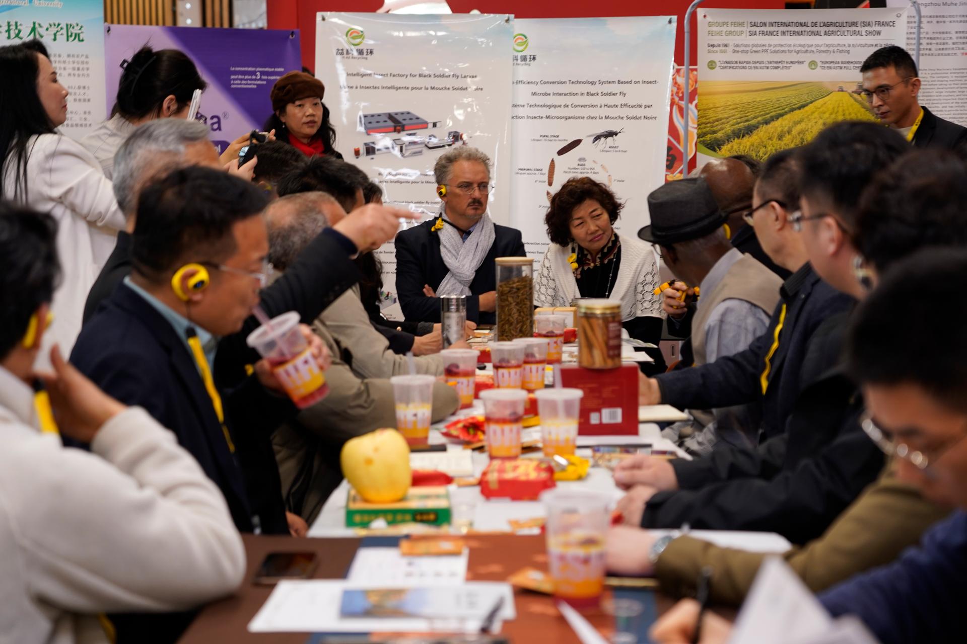中国驻法国大使馆科技公参郭晓林女士(右五)、中国驻法国大使馆农业参赞陈国胜先生(右三)、中国驻法国大使馆科技处一秘李巧巧女士(左四)以及法国农渔业局欧洲与国际事务处国际行动管理支持专员Léonor Hugot女士(左五)等人参观由河南农业大学生命科学学院杨森教授(右四)主持的黑水虻“虫菌互作”项目。该项目创新性地构建了“虫菌互作”双动力系统,通过将动物粪便转化为昆虫蛋白与有机虫粪肥,减少了农业废弃物对环境的压力,提供了优质的饲料资源,并最终助力中药产业的绿色制造,构建起全产业链的闭环生态。