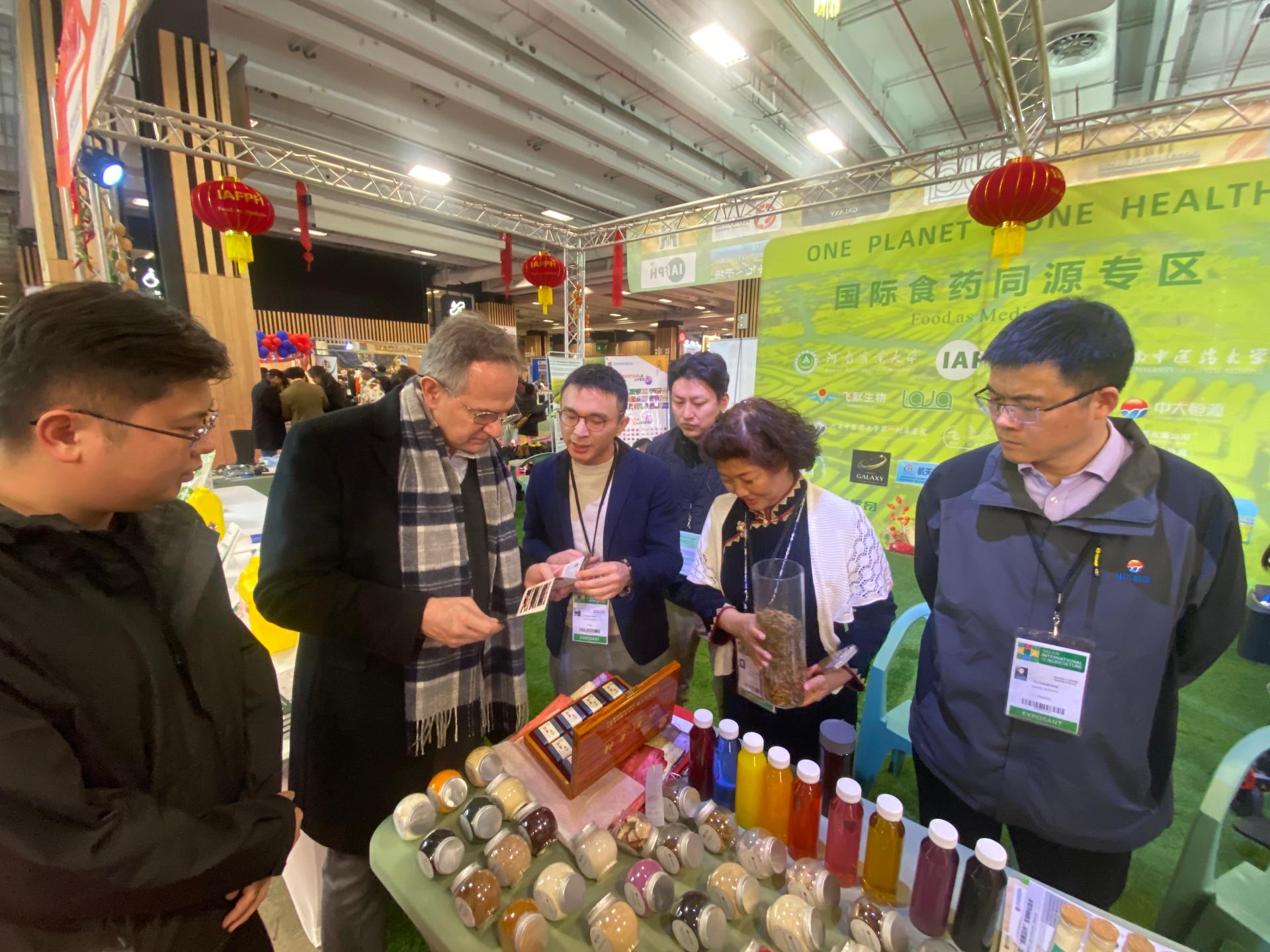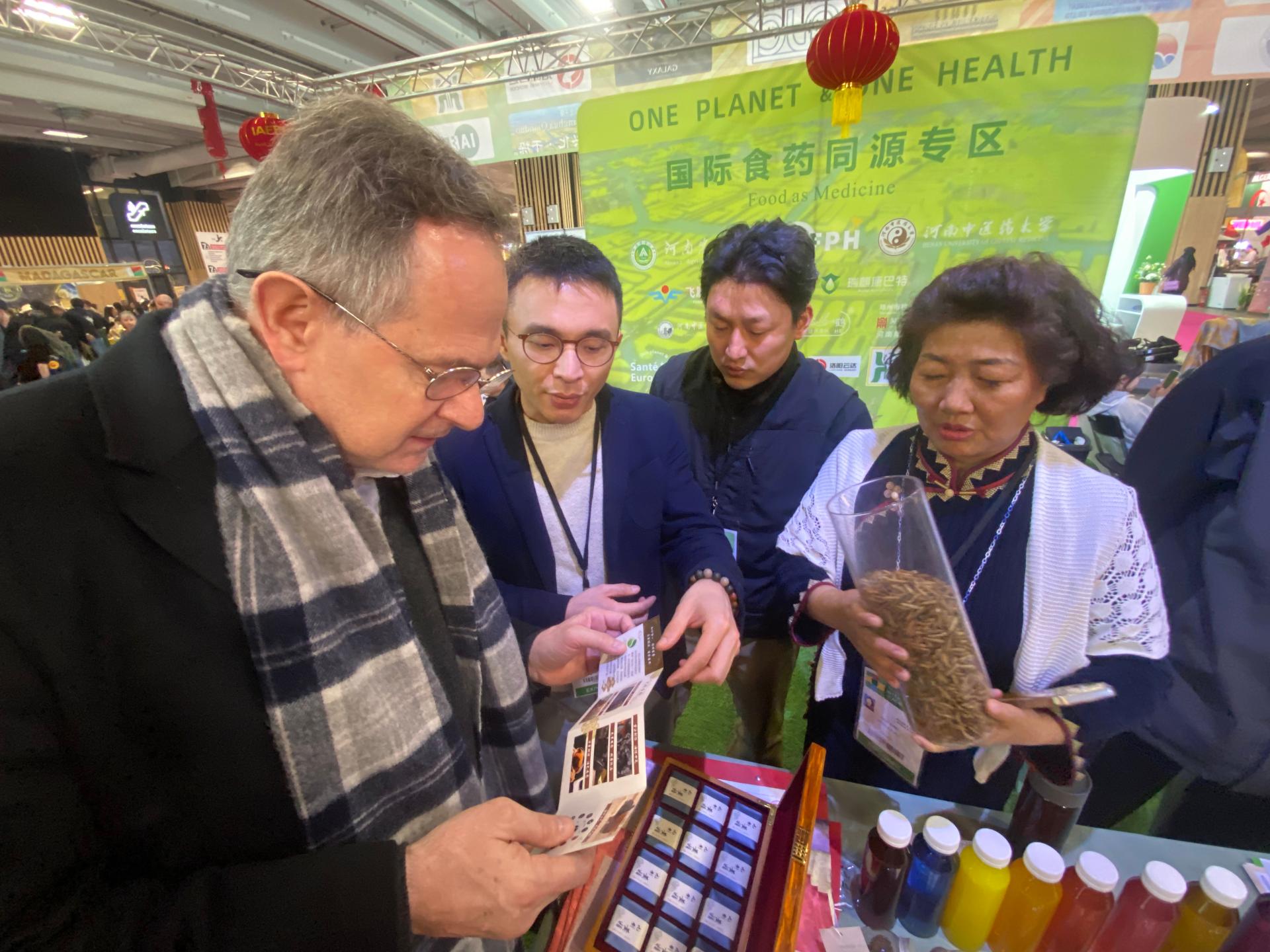 展区工作人员向法国农业部长外事顾问François BLANC介绍展示黑水虻产品和河南农业大学中草药种植系制作的九制黄精。