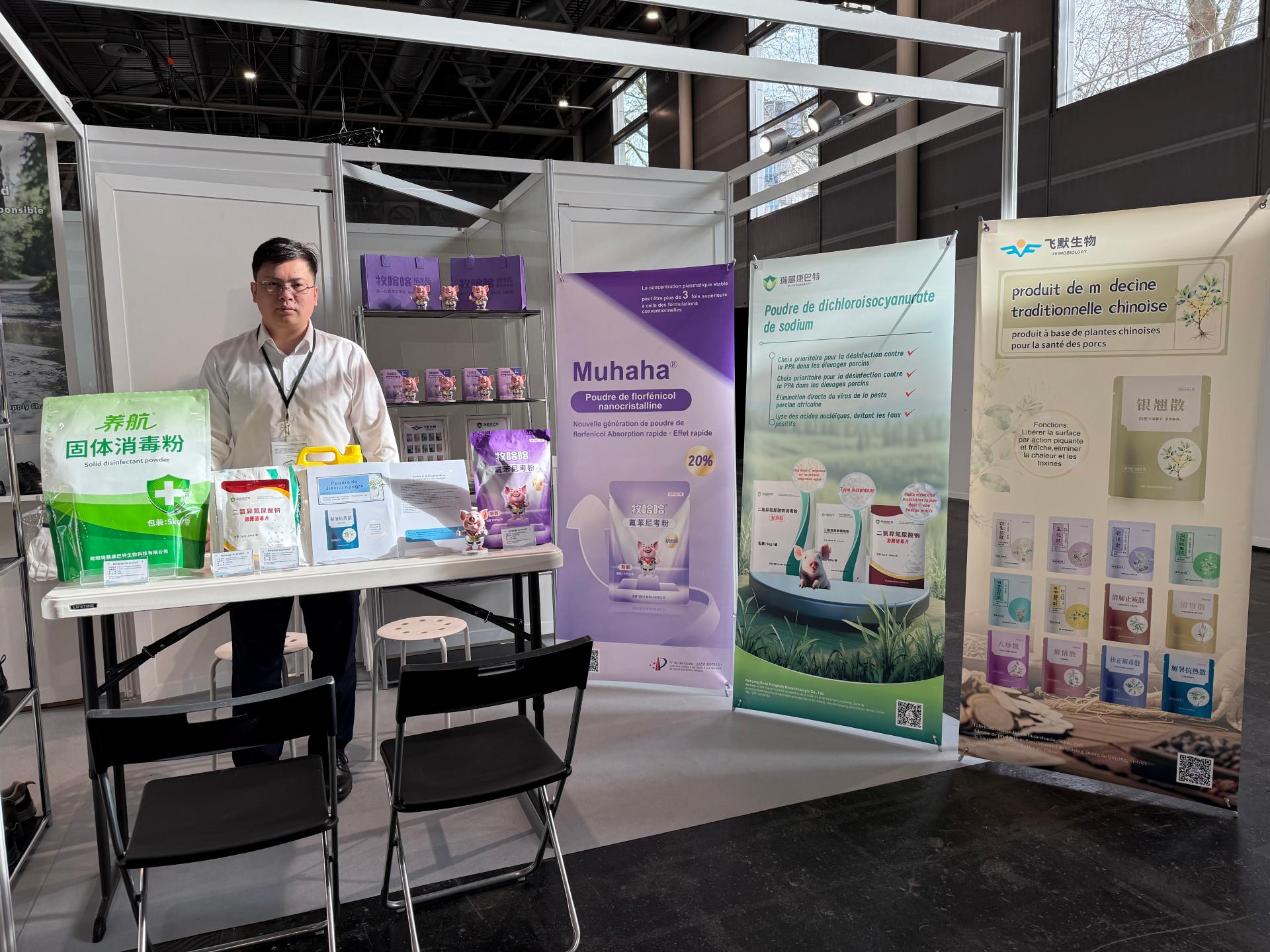 来自飞默生物科技和瑞麒康巴特生物科技有限公司生产的兽用消毒剂、抗生素系列产品以及大容量消毒液,更好地服务于农业生产源头的疫病防控。