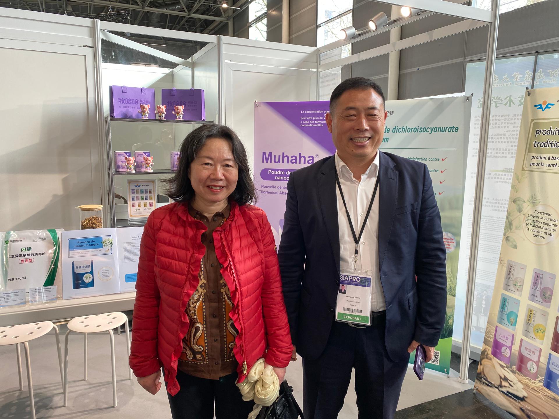 中国驻法国大使馆科技公参郭晓林女士在飞鹤展位前与董事长贾志忠先生交谈